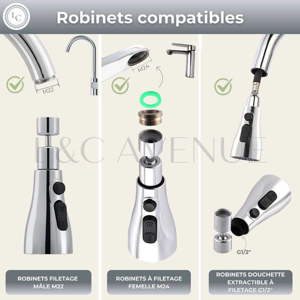 ✔ Autre compatibilité possible : AeraBoost™ peut aussi être installé sur certains robinets à douchette extractible (G1/2"), sous réserve de compatibilité technique.